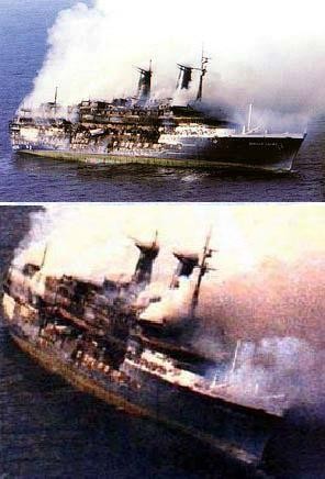 Great to see you have posted my picture of the Angelina Lauro on fire at St Thomas and also my one of her resting on the harbour bottom a week later with Pacific Princess entering the harbour behind her !