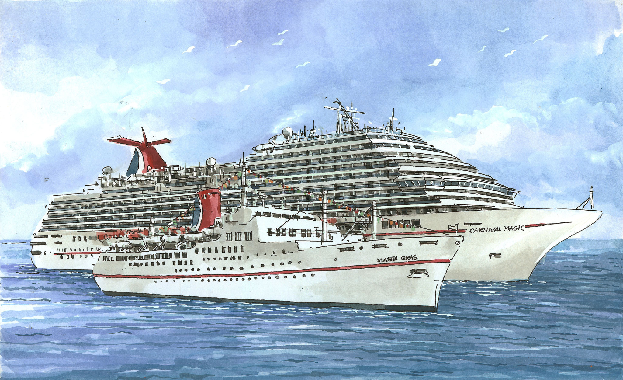 Great drawing! Carnival has come a long way. From that first voyage of the MARDI GRAS running aground on sandbar outside the Port of Miami, to now a leader in the cruise industry.
