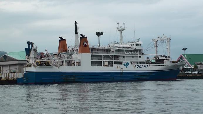 Ferry Toshima Leaves Kagoshima at 23:00, Arrives Kuchinoshima at 05:10 / Leaves at 05:20, Arrives Nakanoshima at 06:05 / Leaves at 06:15, Arrives Tairajima at 07:25 / Leaves at 07:35, Arrives Suwanosejima at 08:20 / Leaves at 08:30, Arrives Akusekijima at 09:15 / Leaves 09:25, Arrives Kodakarajima at 10:35 / Leaves at 10:45, Arrives Takarajima at 11:15 / Leaves at 11:25, Arrives Naze (Amamioshima) at 14:30 / Leaves at 03:00, Arrives Takarajima at 06:05 / Leaves at 06:15, Arrives Kodakarajima at 06:45 / Leaves at 06:55, Arrives Akusekijima at 08:05 / Leaves at 08:15, Arrives Suwanosejima at 09:00 / Leaves at 09:10, Arrives Tairajima at 09:55 / Leaves at 10:05, Arrives Nakanoshima at 11:15 / Leaves at 11:25, Arrives Kuchinoshima at 12:10 / Leaves at 12:20, Arrives Kagoshima at 18:50.