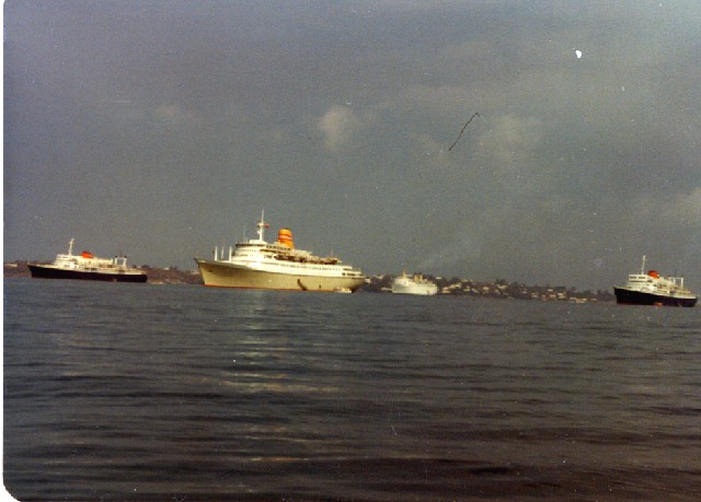 quote:Originally posted by cruiseny:VEENDAM/VOLENDAM (not sure which is which), VISTAFJORD, and DORIC.On second thought, that is SAGAFJORD, not VISTAFJORD... I looked too quickly the first time around, and as a small blur on a fuzzy photo, the outline of SAGAFJORD with her extra deck added above the bridge is curiously like that of VISTAFJORD before any modifications. But the kingposts, private balconies, and a few other things give her identity away.So this means it has to be during 1981, the only year that the SAGAFJORD, with extra deck, and DORIC would have both been in service.Place looks like Hamilton, Bermuda. As to why they're there... To visit the port ? (Bad answer, I know!) Seriously, it must have been some special occasion that all of these ships (including BOTH HAL sisters) were there? Also interesting is that the descendants of all of these ships' owners, are part of Carnival nowadays, even though two of them are technically defunct![ 02-03-2004: Message edited by: cruiseny ]