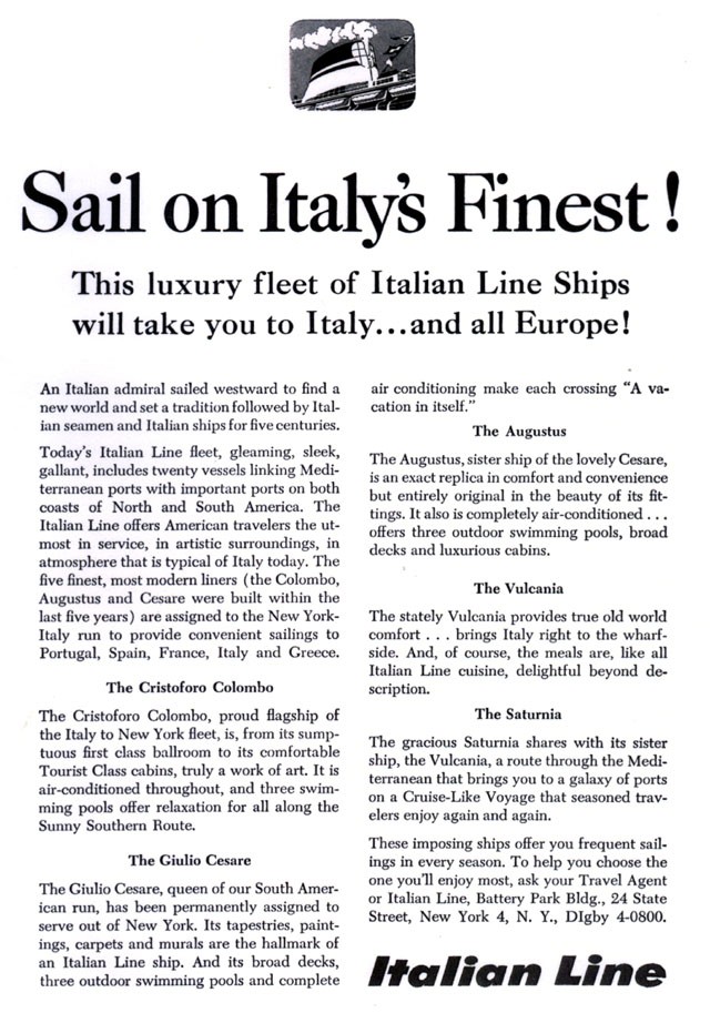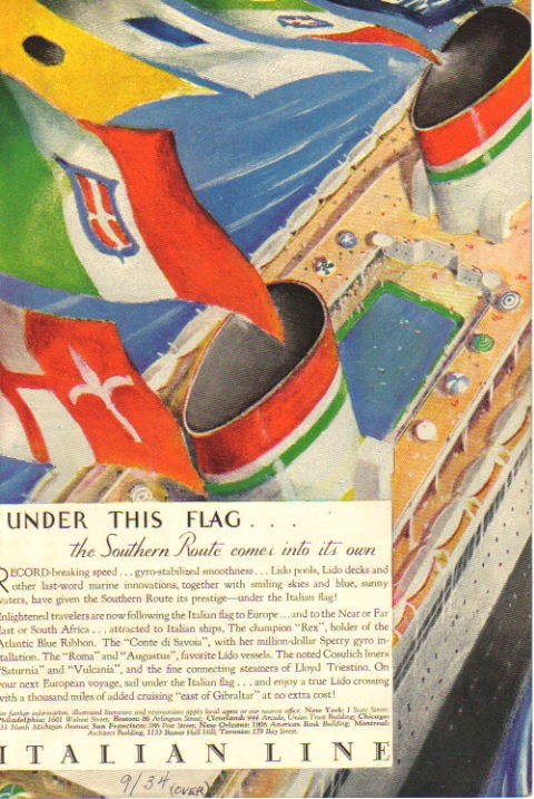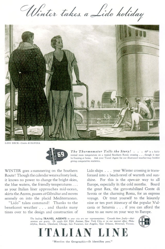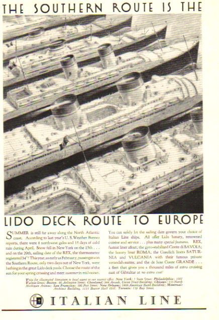 The Italian Line really played up the fact of their warm weather crossings, making a cruise environment on board. The renderings of their ships included ant-sized people, making their swimming pools look bigger than Olympic-size! Here's an advert from April, 1935:
