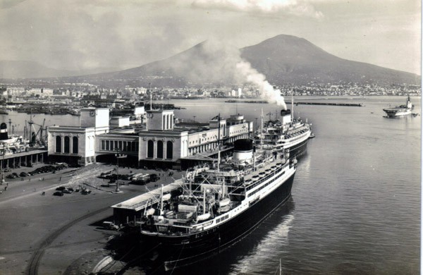 Clockwise, from the left, we see one of American Export's Four Aces, CRISTOFORO COLOMBO, ANDREA DORIA, and VULCANIA. I was just at the Stazione Maritima four months ago, and it is still unchanged after all these years.